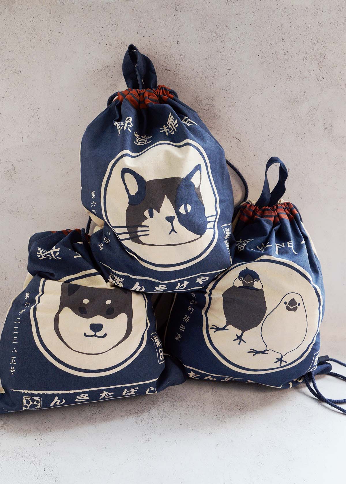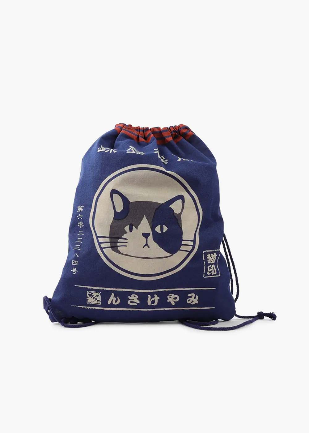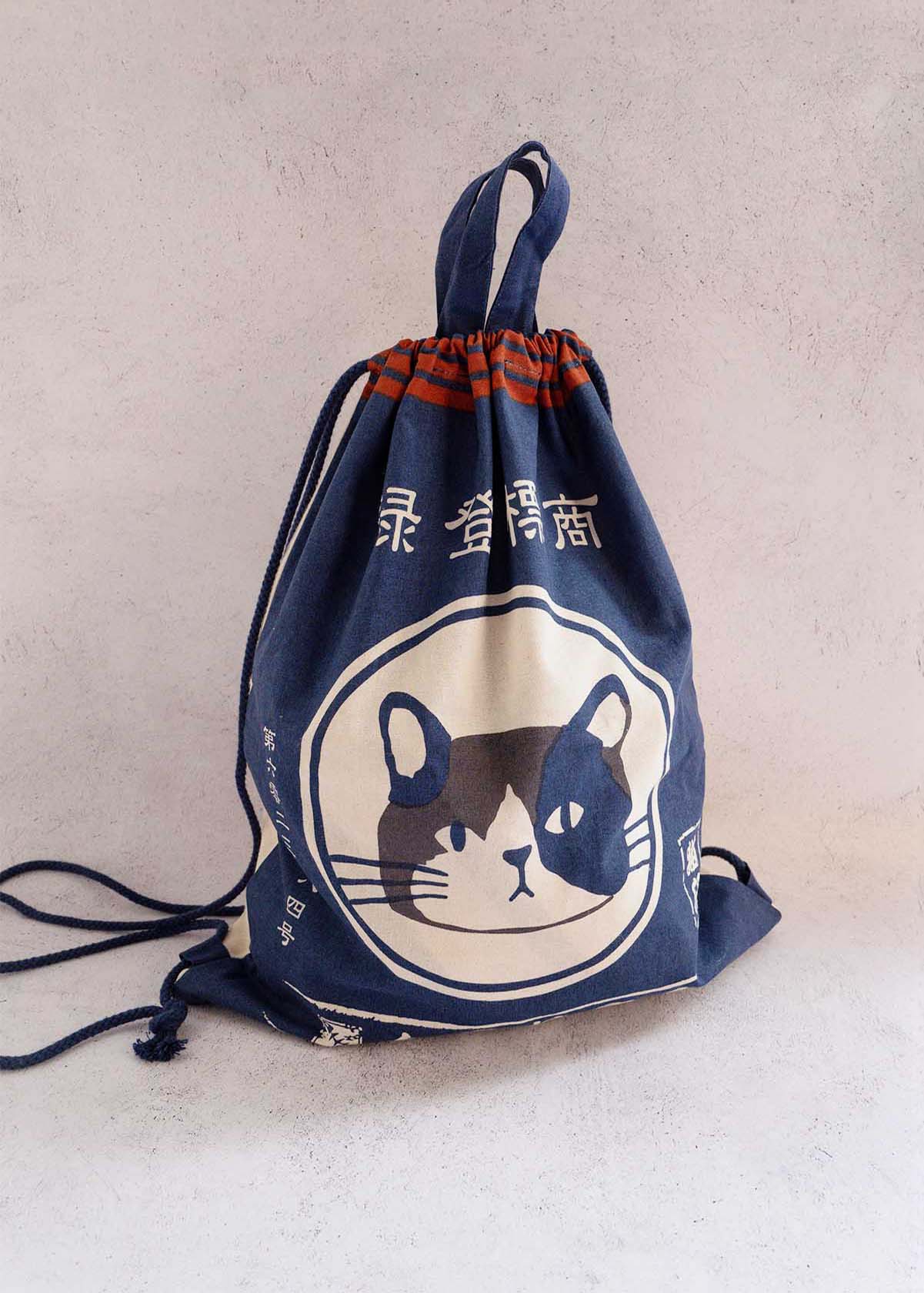 Handcrafted cotton drawstring knapsack faithfully recreating the traditional Japanese kome-bukuro rice bags of the Edo through mid-Showa eras. Deep indigo dye, bold grumpy cat crest, vintage-style shop markings, red-striped opening, and the playful branding “Nyākeyami” (Meow-Meow Fury) perfectly blend authentic heritage with modern dog-loving charm.