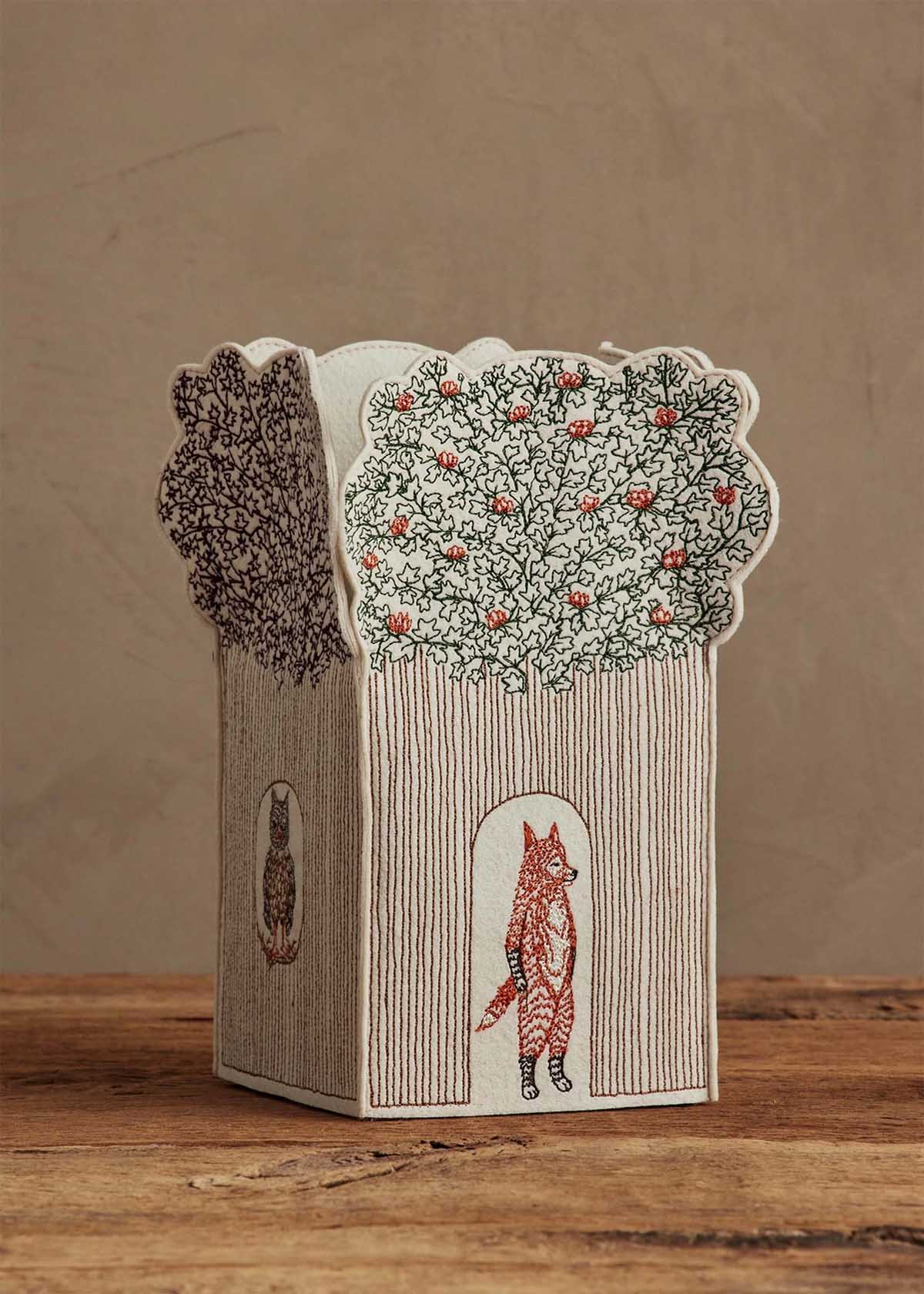 Disguise your tissue box as a treehouse! This tissue box cover depicts a woodland friend and different deciduous tree branches on each side. Find rabbit with a catlapa tree, fox with a tulip poplar tree, bear with a Gingko tree, and owl with a Japanese maple tree. Rotate the cover to match the season: display the blooming poplar and catalpa trees for spring and summer, and the richly embroidered leaves of the Ginkgo and maple trees for fall and winter.