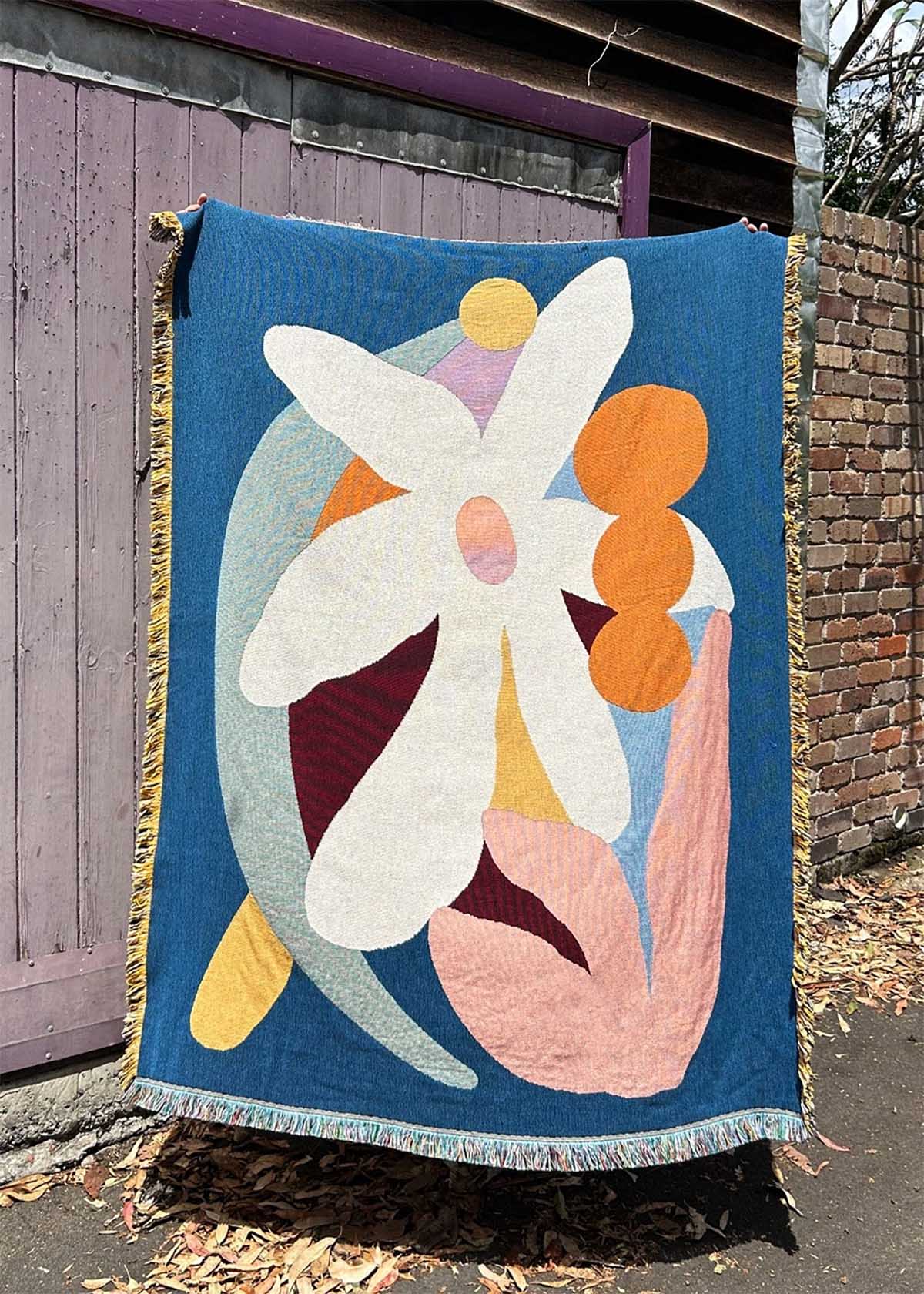 Slowdown Studio collaborates with artists worldwide, turning their original designs into eco-friendly woven throws made from recycled cotton and crafted in the United States. These lightweight, versatile blankets serve as couch covers, bed throws, picnic rugs, or wall art.